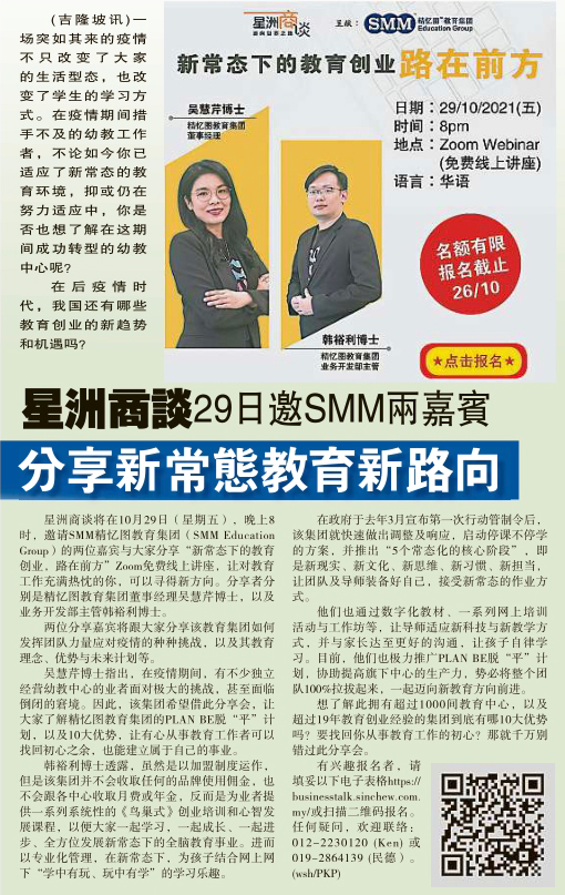 星洲商谈 29 日邀 SMM 两嘉宾,分享新常态教育新路向